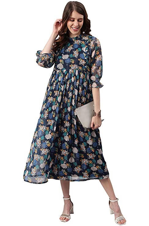 Premium Collection by Janasya. This floral printed poly georgette dress from Janasya will make a great addition to any wardrobe. With ruffles on high neck and princess line this flared dress has all the charm you need for getting that perfect look. When you need an outfit for work and dinner after work, wear this puff sleeve piece with platform heels and some minimalistic jewellery.