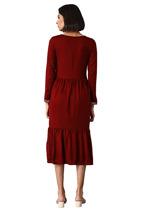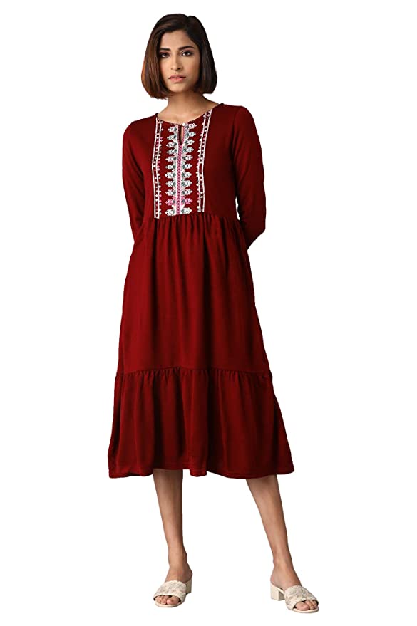 Garnet red winter tiered dress in round neck with rubber printed yoke and gathered sleeves.